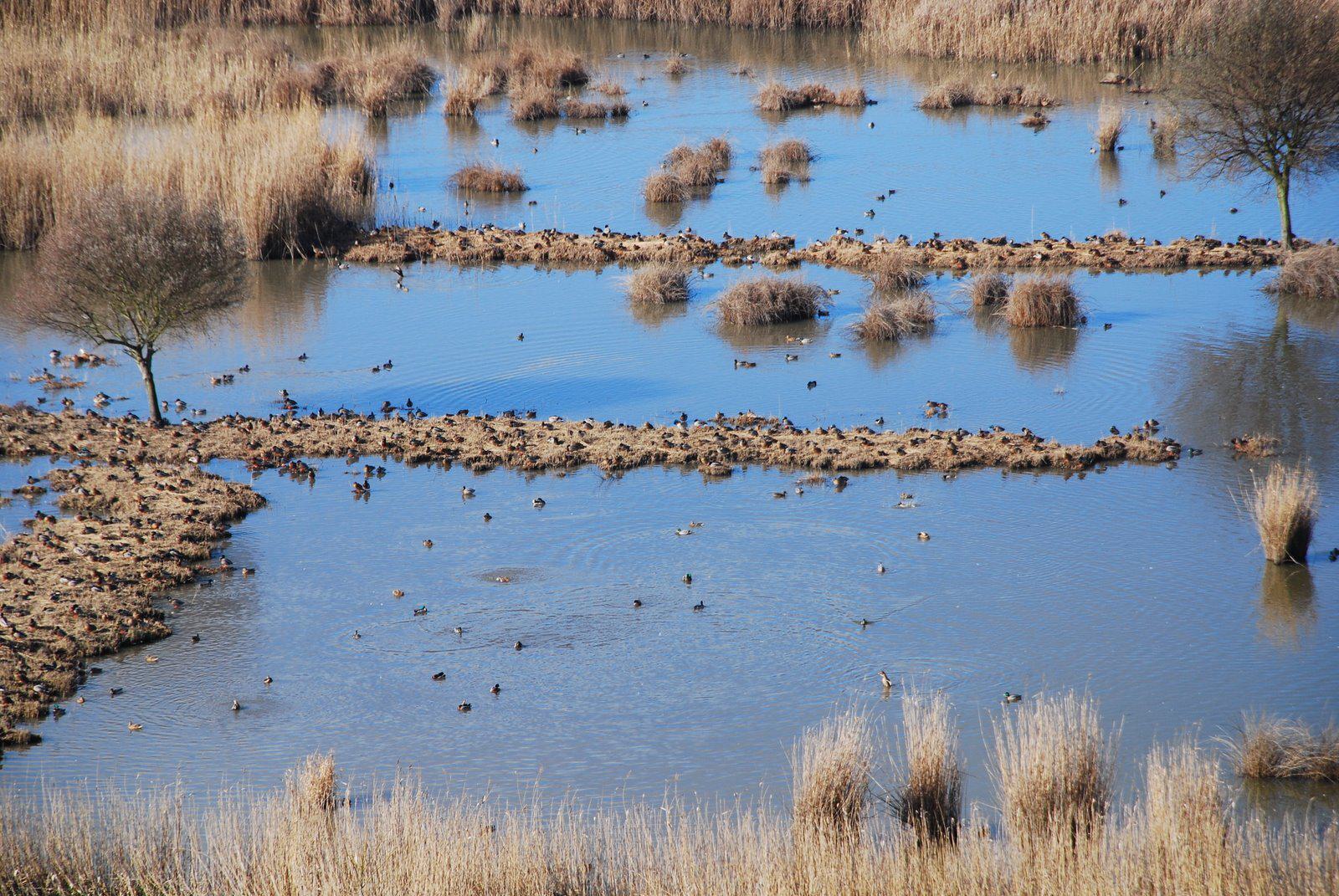 La zone marécageuse est habitée par des roseaux, des joncs, des aulnes, des frênes, des peupliers, des nénuphars et des mourons, tandis que la zone environnante est occupée par des cultures arboricoles irriguées et pluviales.