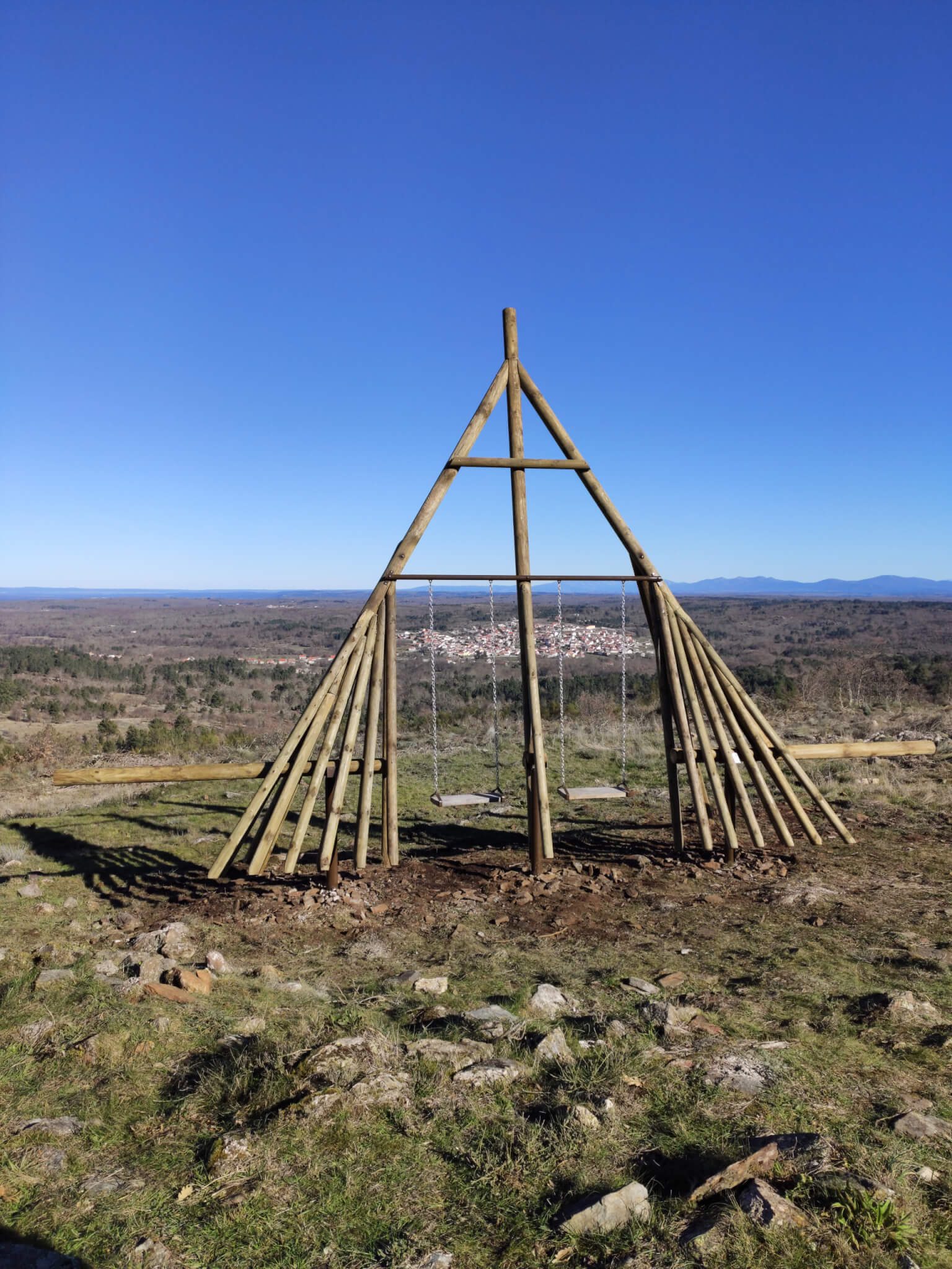 Magnifiquement placée au sommet de la montagne Serra do Homem de Pedra, à côté de la chapelle de Nossa Senhora dos Prazeres, la patronne du village d'Aldeia Velha, cette balançoire panoramique en forme de fourche offre une vue inégalée sur la ville de Guarda et la Serra da Estrela.