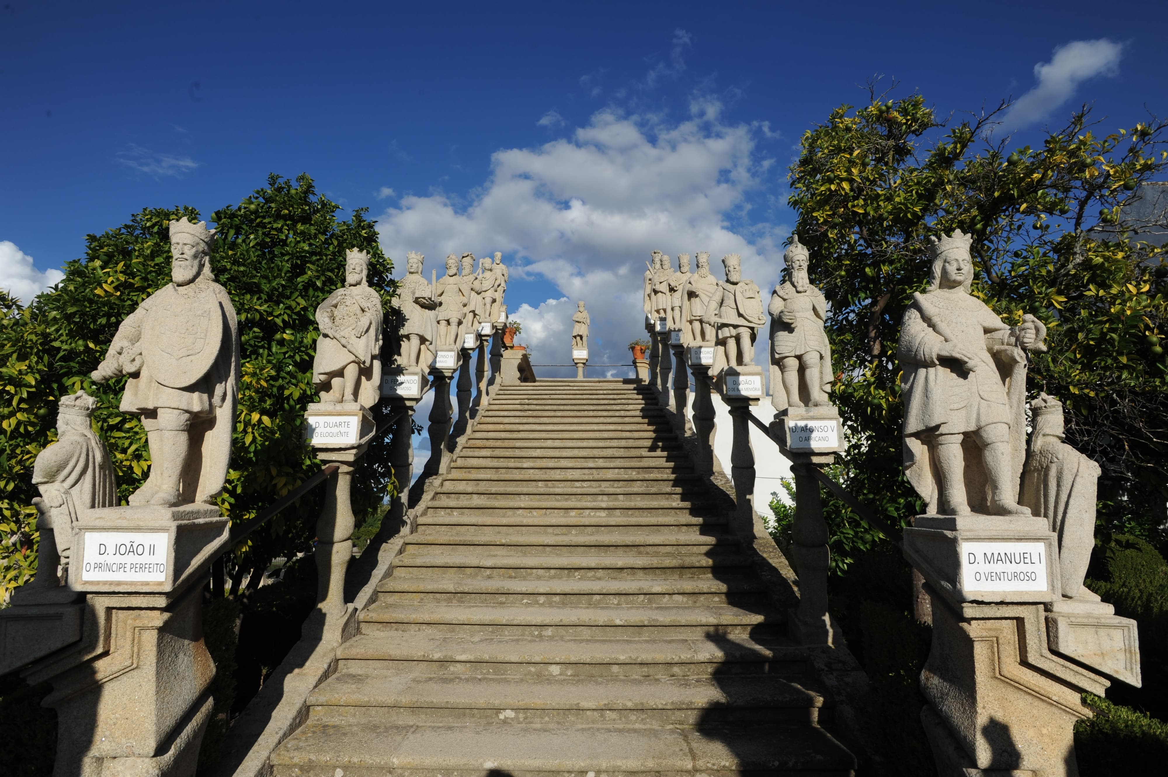 This is also where we find the Steps of the Kings, amazing fountains and water games. Among the elegant bush beds of fine cut, stand symbolic statues of granite, representing the New Men, the Four Cardinal Virtues, the Three Theological Virtues, the Zodiac, the Parties of the World, the Four Seasons, Fire and Hunting. Arranged in the manner of staircase, there are representations of the Apostles and the Kings of Portugal until D. José I.