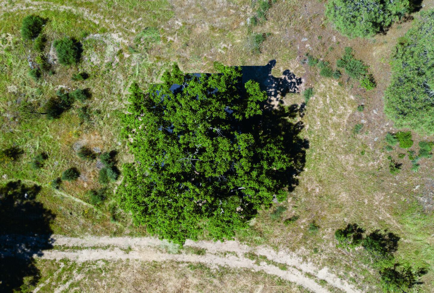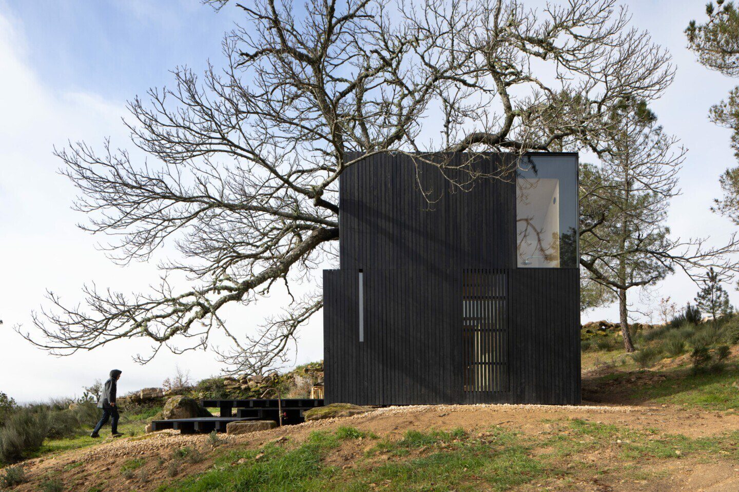 A sombra do castanheiro protege a casa no Verão mas a sua ausência de folhas no Inverno ajuda a expô-la à luz solar. As janelas, rasgadas em cada alçado, permitem que a brisa suave da região atravesse todo o espaço interior e o refresque durante as noites quentes de Verão.