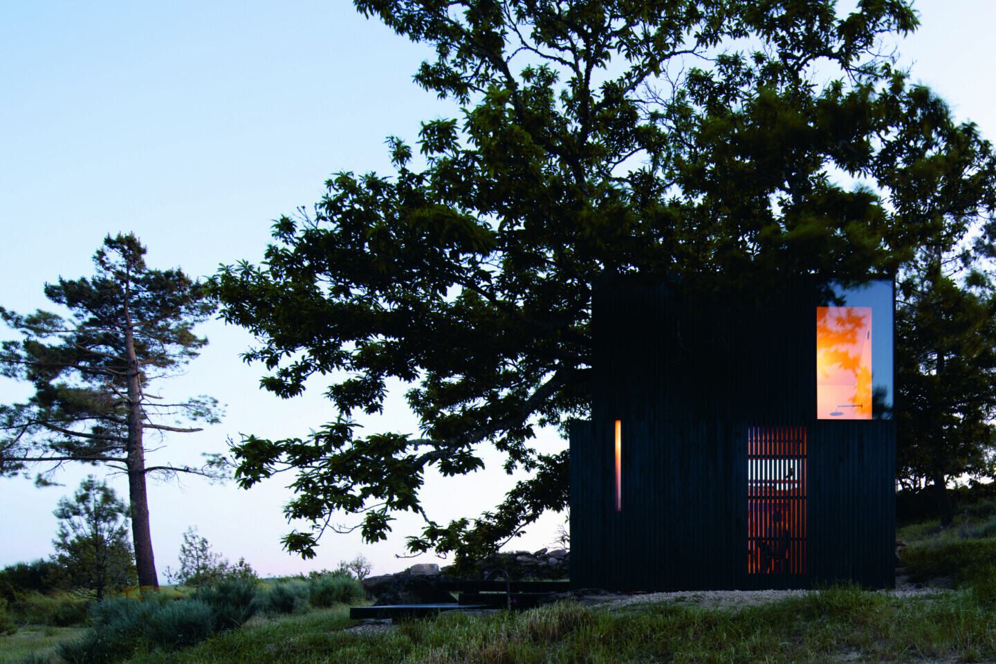 A Casa no Castanheiro é uma cabana, uma estrutura modular simples e leve, de madeira e cortiça, que tira partido pleno da paisagem e favorece o carácter de isolamento. Abraçando um castanheiro secular, como que o protegendo e sendo protegida por ele, é o refúgio ideal.